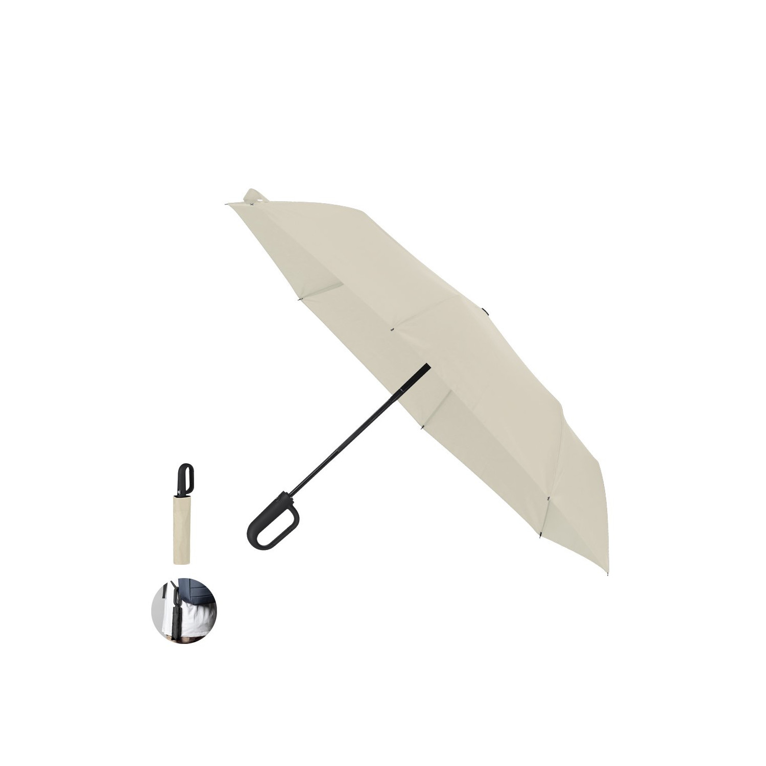 Ombrello pieghevole a 8 pannelli in RPET. 100 cm di diametro, apertura e chiusura automatica, sistema antivento e in materiale resistente al pongee. Con aste in fibra di vetro nera, chiusura in velcro e manico ergonomico con moschettone integrato a gancio. Presentato in un caso individuale corrispondente. Include il distintivo logo RPET.