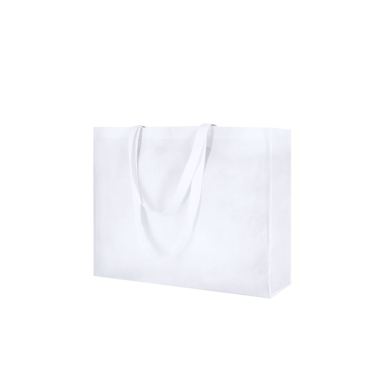 Borsa in TNT da 80 g/m2 in una gamma di colori vivaci. Con manici lunghi 75 cm, soffietto rinforzato con bordino in tinta e finitura cucita. Resistente fino a 4 kg di peso.