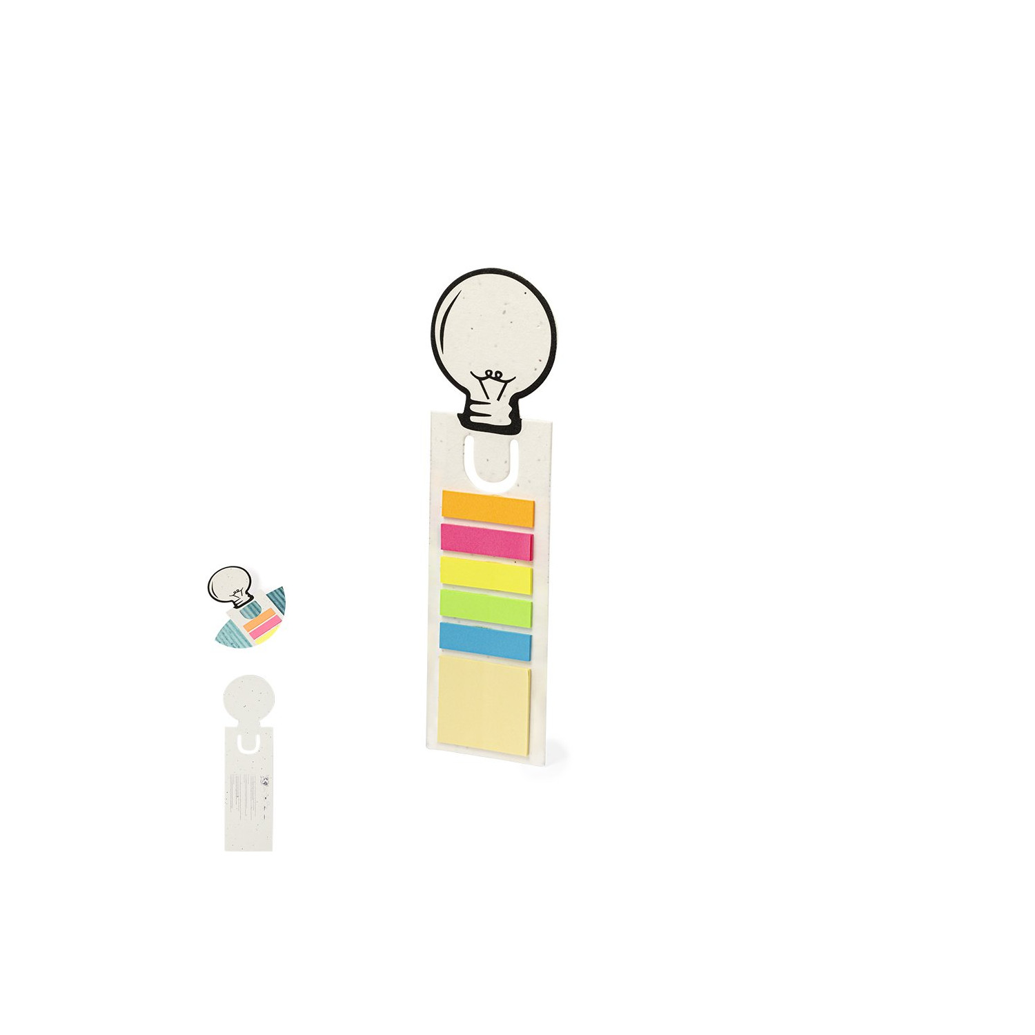 Originale segnalibro in carta di semi, con il caratteristico disegno di una lampadina sulla parte superiore. Dispone inoltre di post-it adesivi di varie forme e colori: 15 post-it 4x4,5 cm in giallo e 75 mini post-it 1,2x4,5 cm in cinque colori diversi. La carta include semi di petunia, che la rendono piantabile alla fine del suo ciclo di vita. Include istruzioni per la semina sul retro della copertina e viene fornito in un sacchetto individuale di carta riciclata.