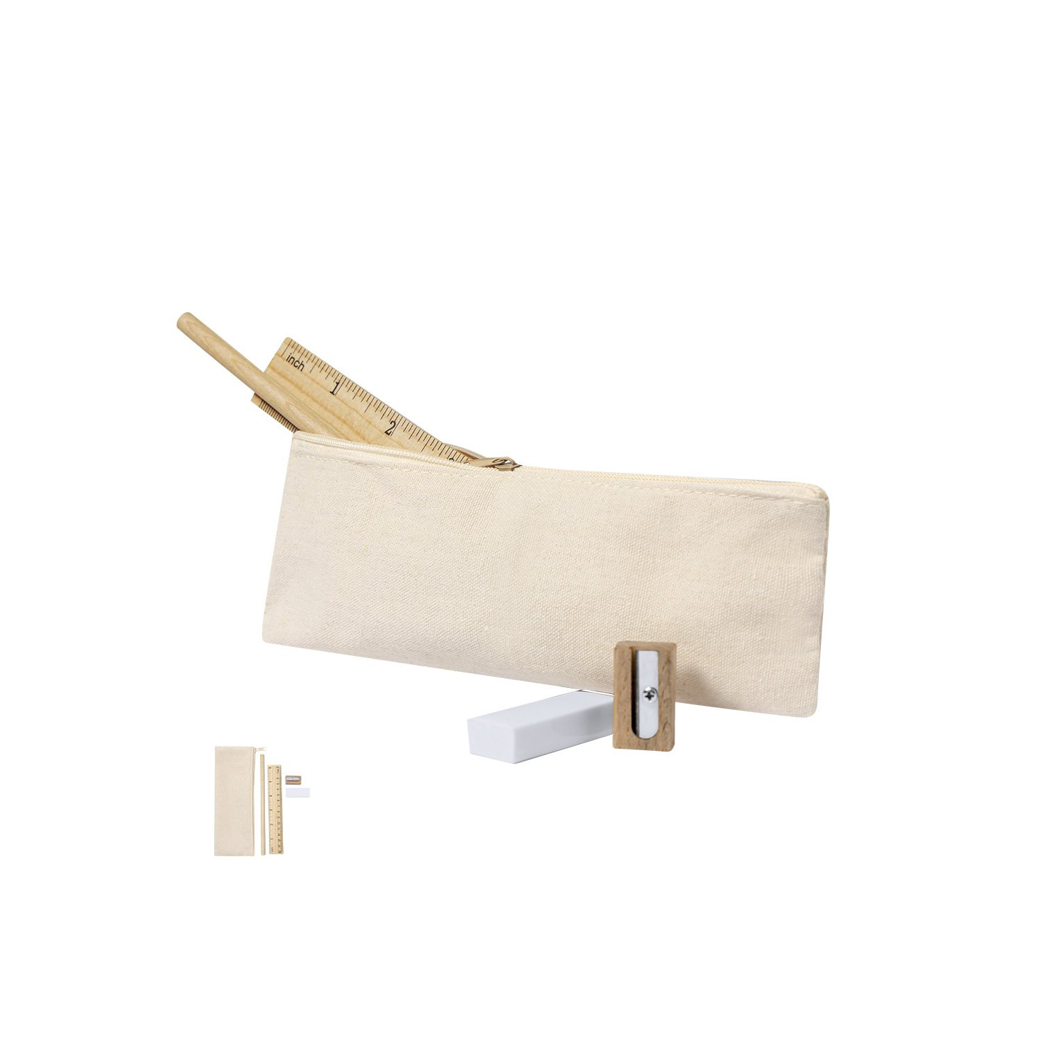 Set di 4 pezzi presentato in astuccio di cotone con chiusura a cerniera. Include:- Matita di legno con corpo rotondo di finitura naturale e mina nera- Riga da 15 cm con sistema metrico in centimetri/pollici- Gomma da cancellare- Temperamatite