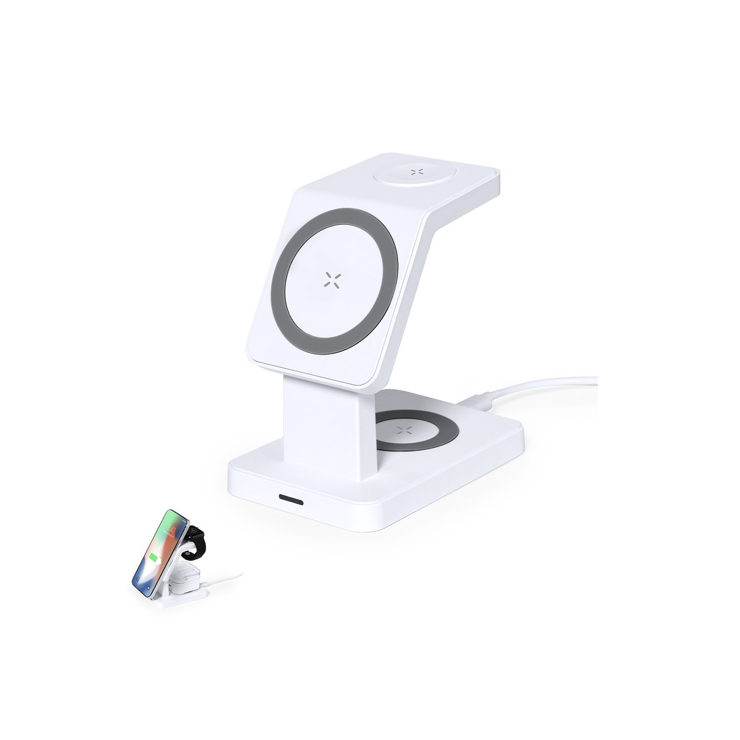 Caricatore multiplo wireless completo da 15W con supporto per gadget. Progettato per la ricarica simultanea di smartphone, cuffie e smartwatch: una stazione di ricarica all-in-one. Presentato in una scatola di design kraft. Manuale di istruzioni disponibile in inglese e spagnolo.