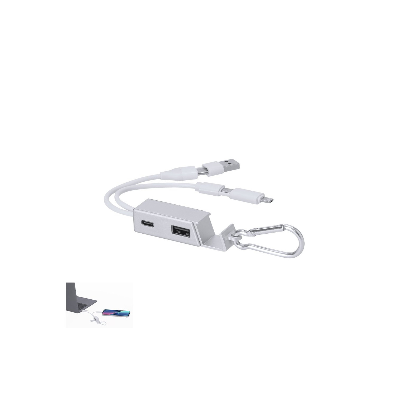 Caricatore USB con hub realizzato in alluminio riciclato con supporto integrato per smartphone. Include due connessioni a doppia uscita Tipo C/USB e Tipo C/Lightning, e due connessioni di ingresso Tipo C e USB. Con moschettone per un facile trasporto. Con logo in alluminio riciclato inciso sulla custodia.L'alluminio riciclato è un materiale con possibilità di riciclo quasi infinite, senza perdere le sue proprietà originali e consumando meno energia nel processo.Certificazione GRS (Global Recycled Standard), che garantisce l'origine riciclata del materiale utilizzato per fabbricare il prodotto.