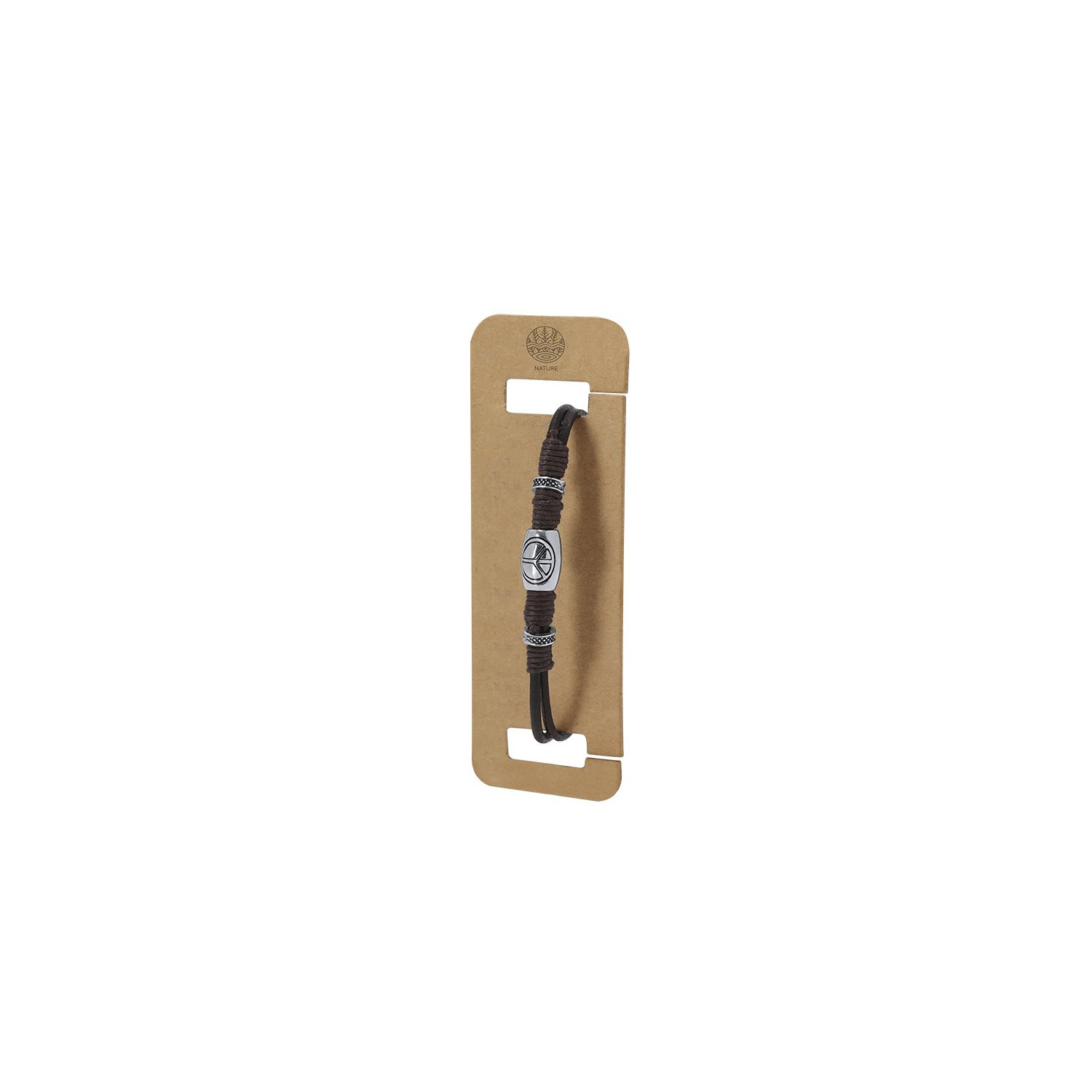 Bracciale in pelle marrone decorato con corde di cotone cerato e perline placcate in argento, una delle quali con il simbolo della pace. Con una chiusura in lega color argento originale. Presentato in una scatola di cartone kraft con una superficie per il branding.