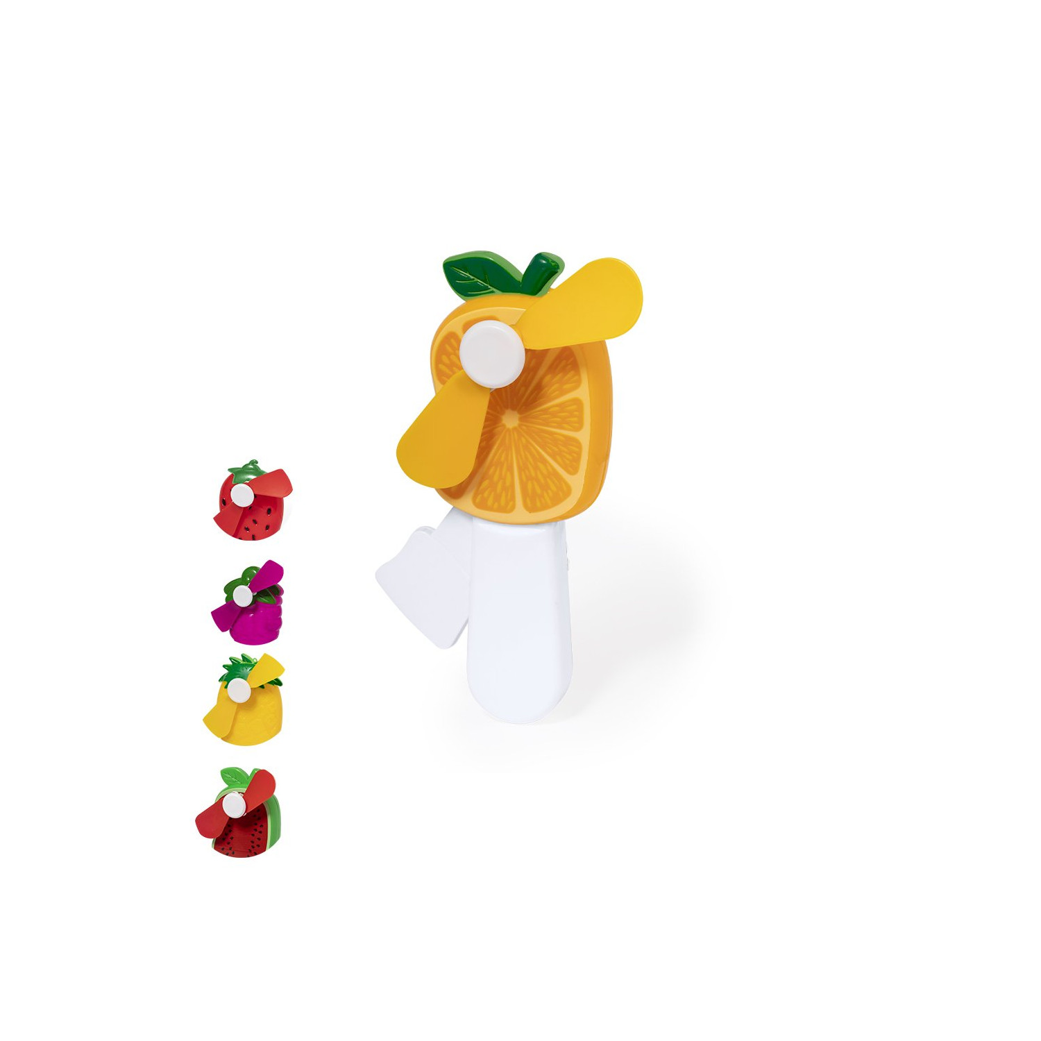 Ventilatore con divertenti forme di frutta, realizzato in robusto ABS. Si aziona manualmente premendo continuamente la leva integrata nell'impugnatura per muovere le pale. Disponibile nei modelli fragola, ananas, uva, anguria o arancia. Confezionato singolarmente in un sacchetto riciclato.