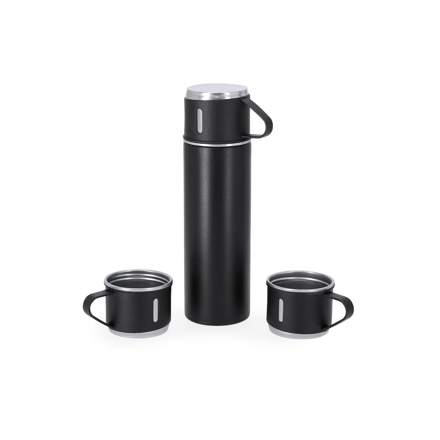 Set di bottiglia termica e 3 tazze in acciaio inossidabile. Termos a doppia parete con capacità di 420 ml, garantendo una migliore e più duratura conservazione della temperatura, con distributore di sicurezza. Tazze da 140 ml con regolazione a vite in un elegante design nero, ottimo per gustare una bevanda calda o fredda, in qualsiasi momento e ovunque. Presentato in un elegante astuccio nero.