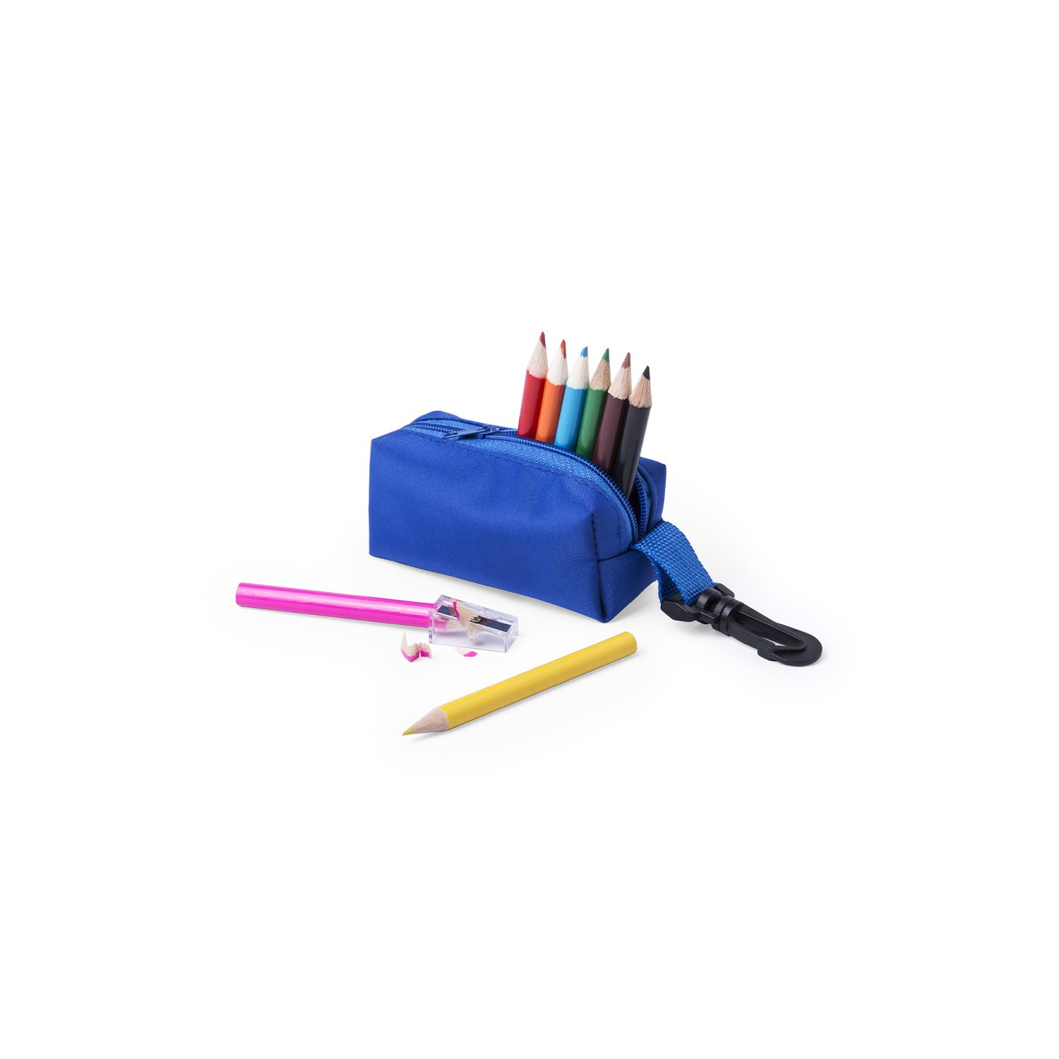 Astuccio con chiusura a zip in poliestere 420D, in diversi colori e con moschettone girevole. Include temperamatite e 8 matite con corpo rotondo e finitura lucida in diversi colori.