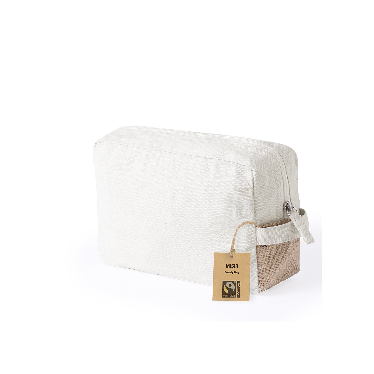 Beauty Case Fairtrade della linea natura, realizzata in cotone. Scomparto principale con chiusura a zip e manico coordinato, con lati e base rinforzati in juta. In elegante tonalità naturale. Include etichetta Fairtrade ed etichetta con logo su cartone riciclato.Certificato Fairtrade, un sistema alternativo al commercio convenzionale che mira a promuovere lo sviluppo dei popoli e la lotta alla povertà.