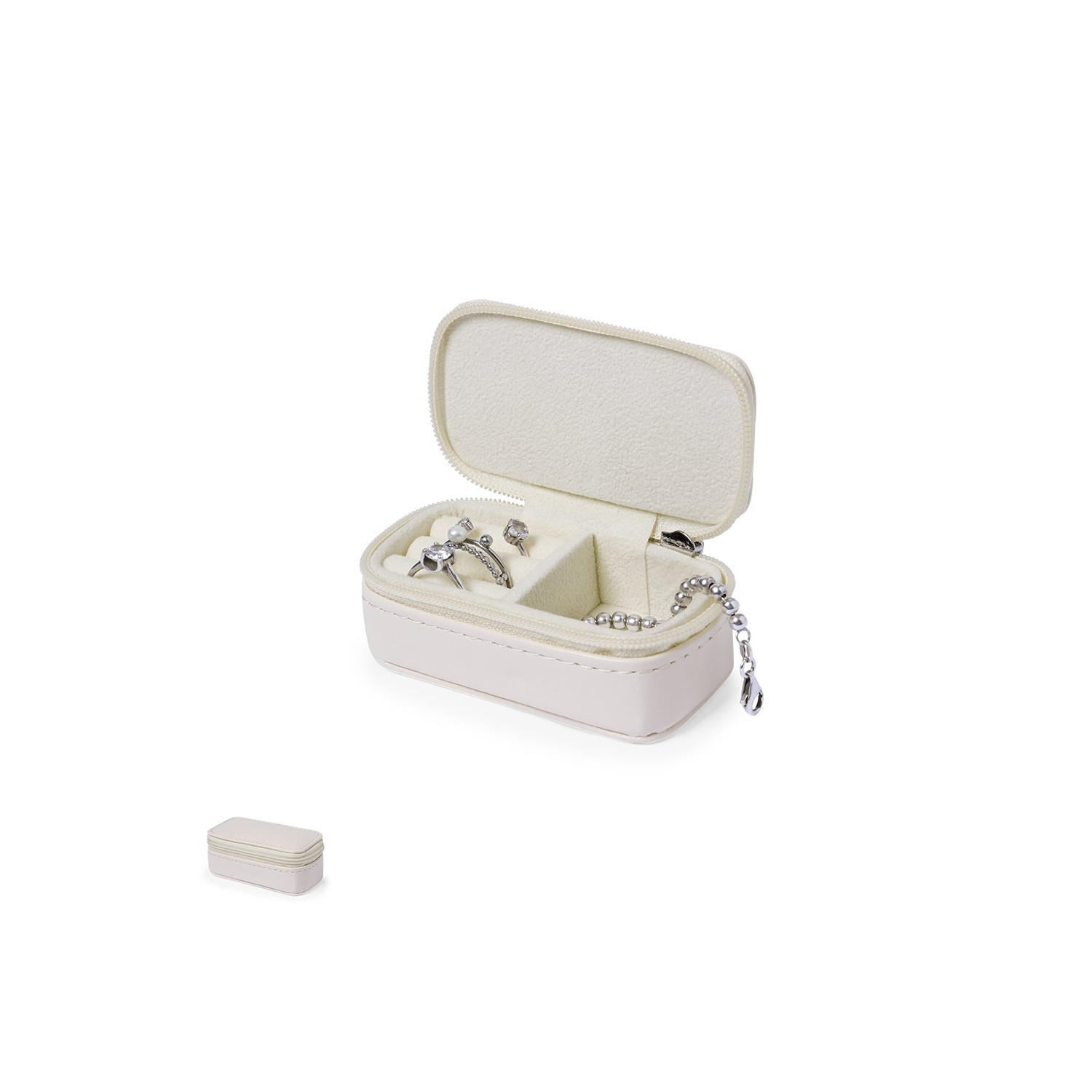 Portagioie in finta pelle. Design in colore naturale con chiusura a zip e due scomparti interni. Uno scomparto a forma di scatola e un altro scomparto con cuscinetti per contenere anelli e orecchini, foderato in morbido tessuto. Presentato in un sacchetto di carta individuale.