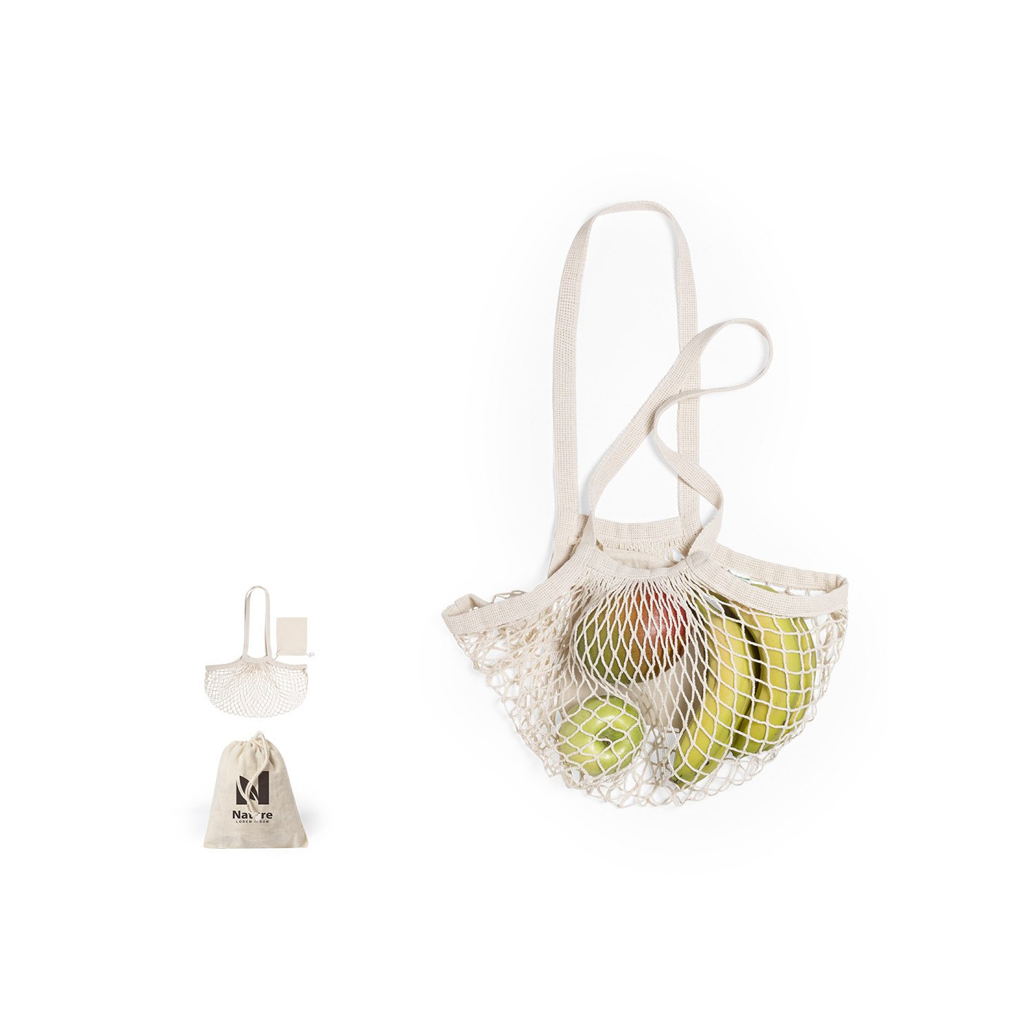 Borsa a rete pieghevole di grande capacità. Linea Nature in cotone grezzo, con una custodia liscia per la stampa con una chiusura in pizzo. Manici lunghi e piccolo pieghevole per un facile trasporto.