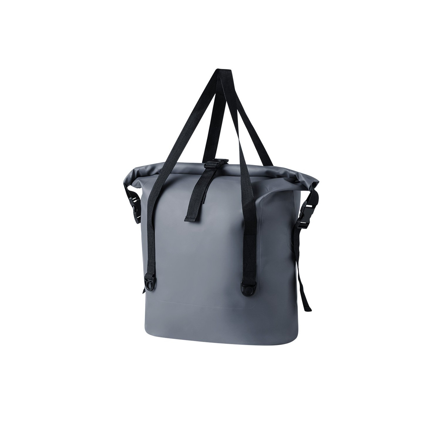 Borsa impermeabile con capacità di 25L, realizzata in PVC resistente. Scomparto principale con tripla chiusura a fibbia e manici per un trasporto confortevole. In un elegante colore grigio con accenti neri e presentata in una borsa individuale riciclata.