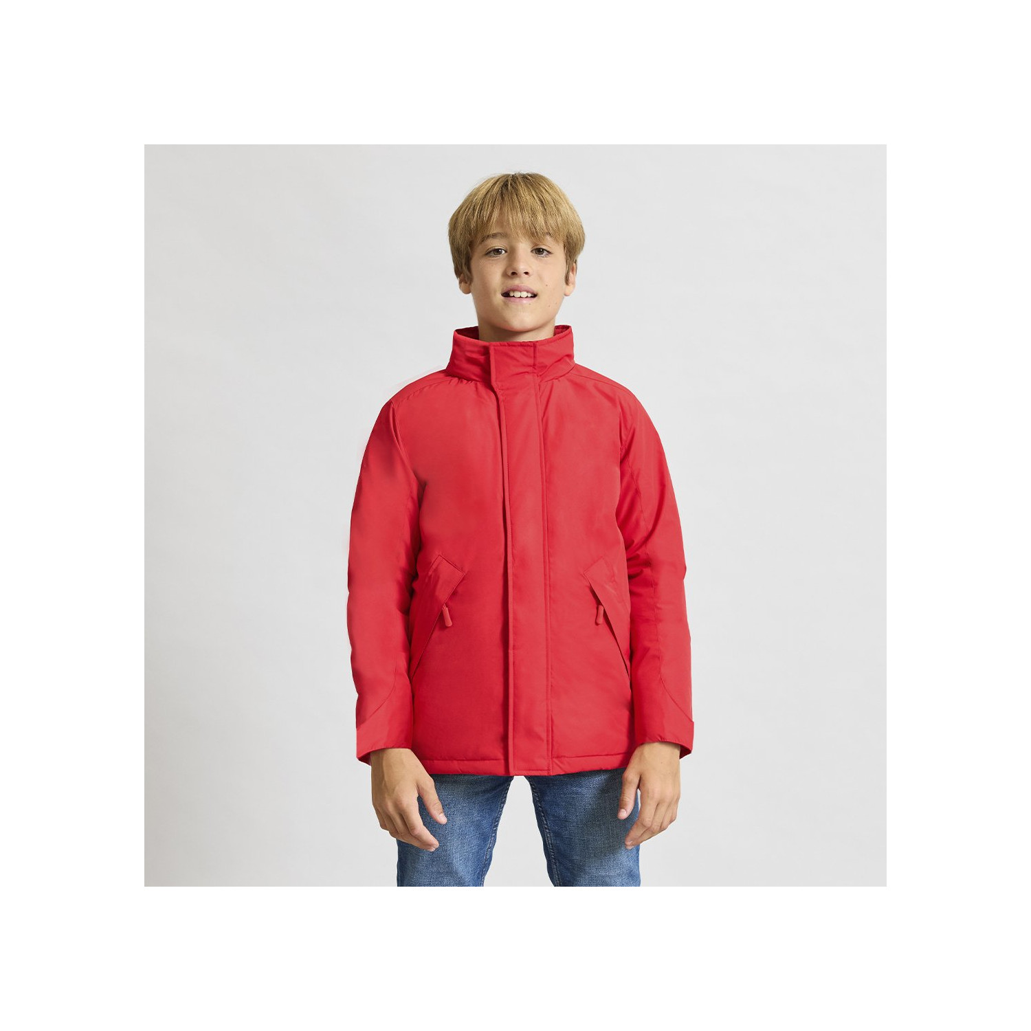 Parka imbottito unisex per bambini realizzato in tessuto impermeabile 100% RPET (poliestere riciclato). Con collo alto e cappuccio regolabile e pieghevole, integrato con chiusura in velcro. Chiusura centrale con zip tono su tono e patta protettiva, tasche laterali con zip e patta fissa coordinata. Include una tasca interna con chiusura in velcro. Polsini regolabili con velcro. Fodera in pile su collo e interno delle tasche per maggiore comfort. Con accesso interno per marcatura su petto sinistro e schiena, ideale per la personalizzazione. Con etichetta RPET tono su tono.