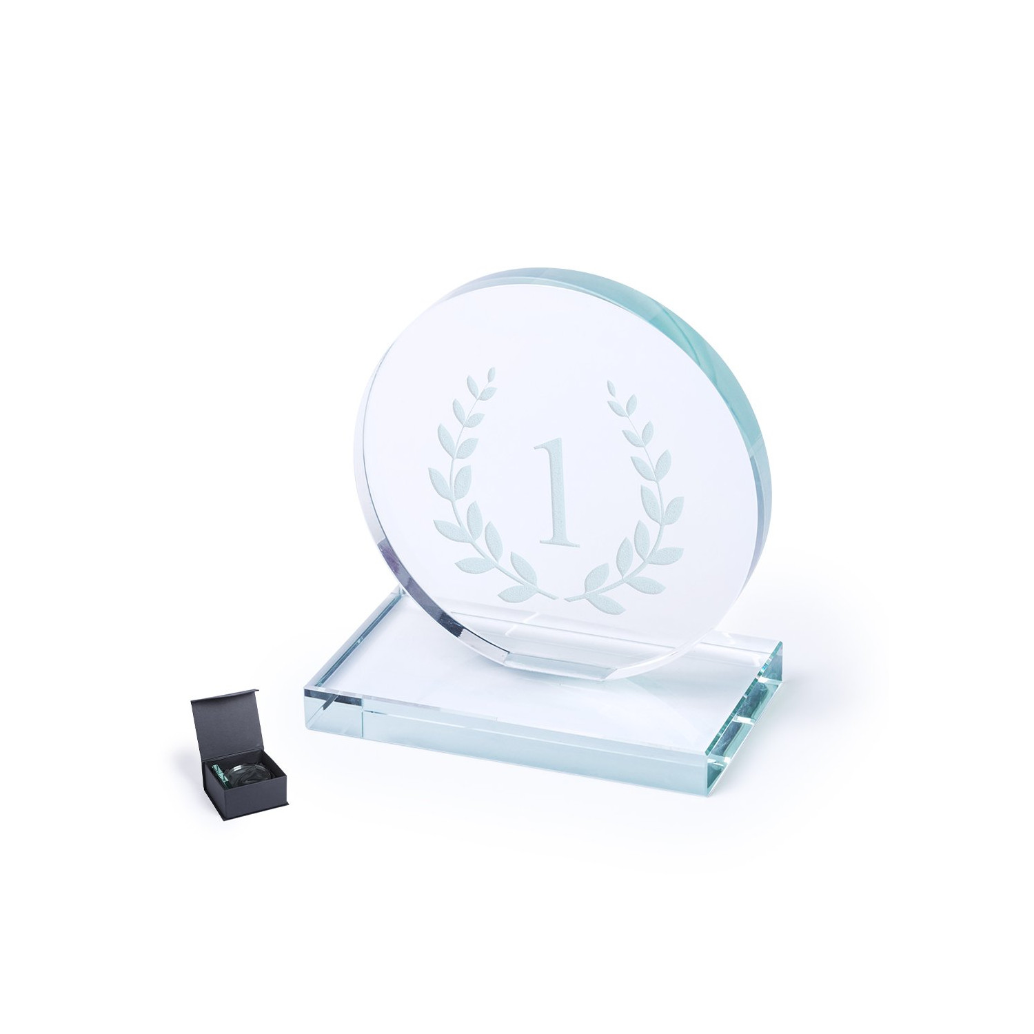 Targa per trofei in vetro spesso con elegante design circolare e base quadrata. Appositamente progettata per la stampa laser e presentata in una custodia protettiva individuale.