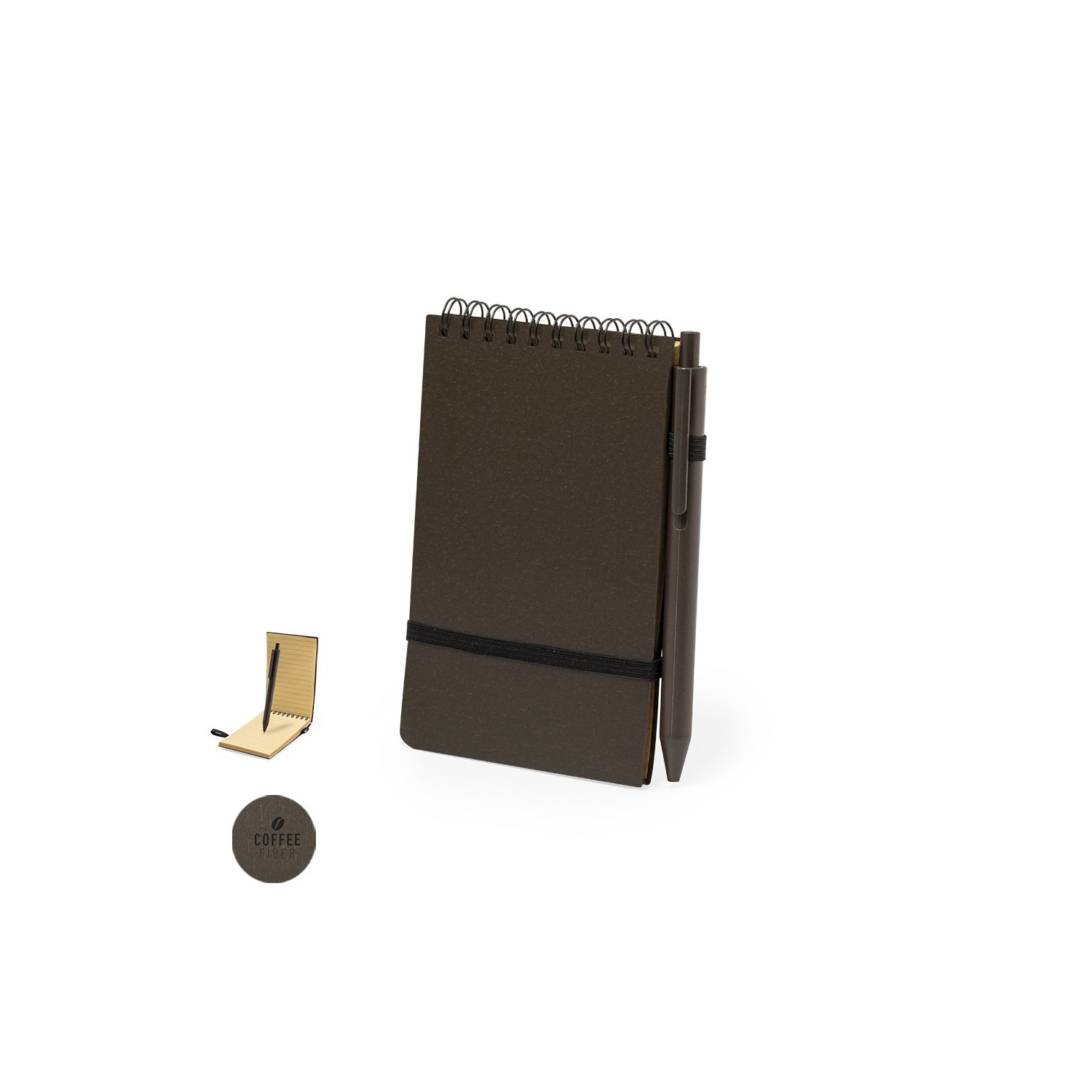 Set di taccuino e penna in fibra di caffè. Quaderno a doppio anello con copertina morbida, chiusura elastica e portapenne. Con 70 pagine e layout a righe singole. Meccanismo a pulsante con inchiostro blu. Include il logo Fibra di Caffè stampato sul taccuino e sulla penna. Presentato in una busta individuale riciclata.La fibra di caffè è ricavata dagli scarti della produzione del caffè. Un'alternativa sostenibile che aiuta a ridurre l'uso della plastica, risparmiando energia nel processo di produzione e promuovendo così la cura dell'ambiente.