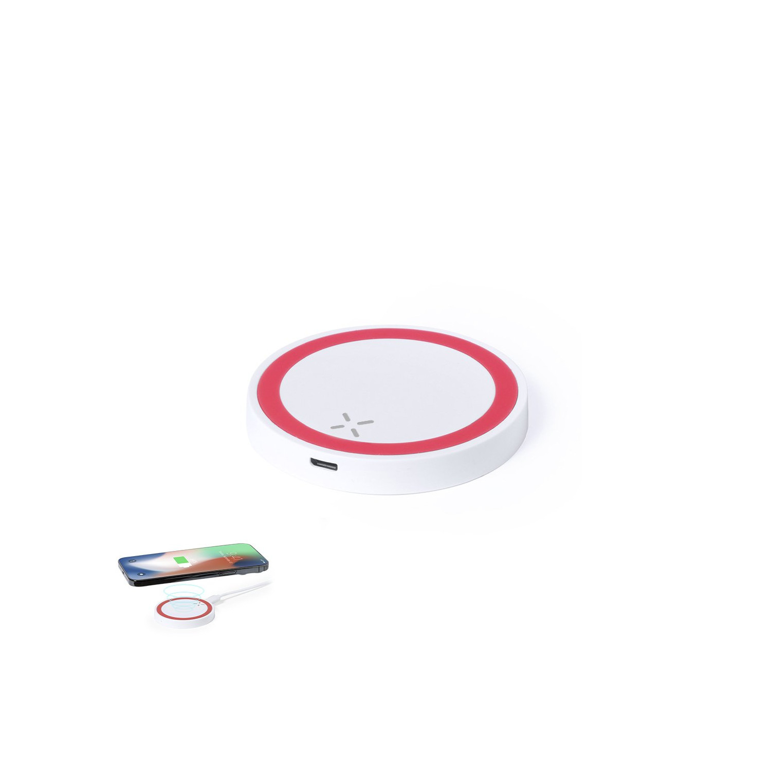 Caricatore wireless circolare con design bicolore. Con base antiscivolo e indicatore di stato di carica a LED. Compatibile con gli smartphone dotati di tecnologia di ricarica wireless e presentato in una scatola dal design accattivante.