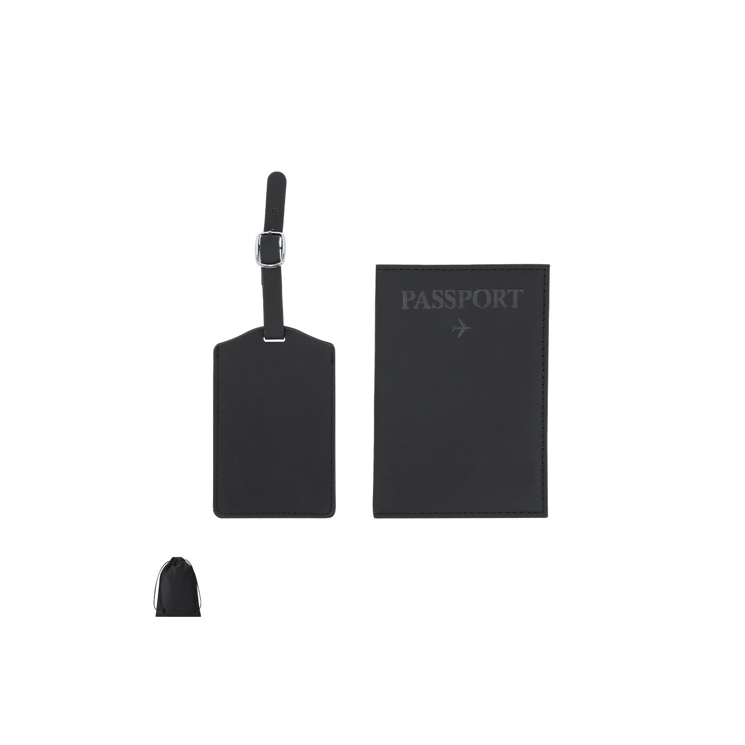 Set da viaggio composto da portapassaporto ed etichetta per bagaglio, realizzati in morbido PU. Portapassaporto con scomparto speciale per passaporto e ulteriore scomparto per carta. Etichetta con cinturino regolabile e fibbia argentata, inclusa scheda con campi dati compilabili. Presentato in custodia nera.