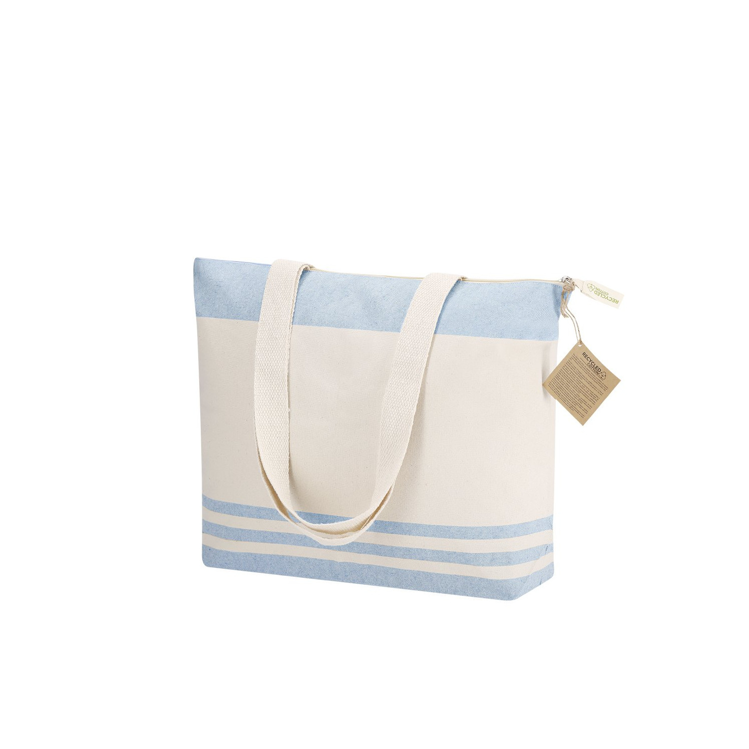 Borsa realizzata principalmente con cotone riciclato da 300 g/m2 in un elegante tono naturale con un design a righe orizzontali di colore. Con il supporto alla base e ai lati. Manici lunghi da 70 cm con rinforzo, finitura cucita. Logo sull'etichetta della cerniera.