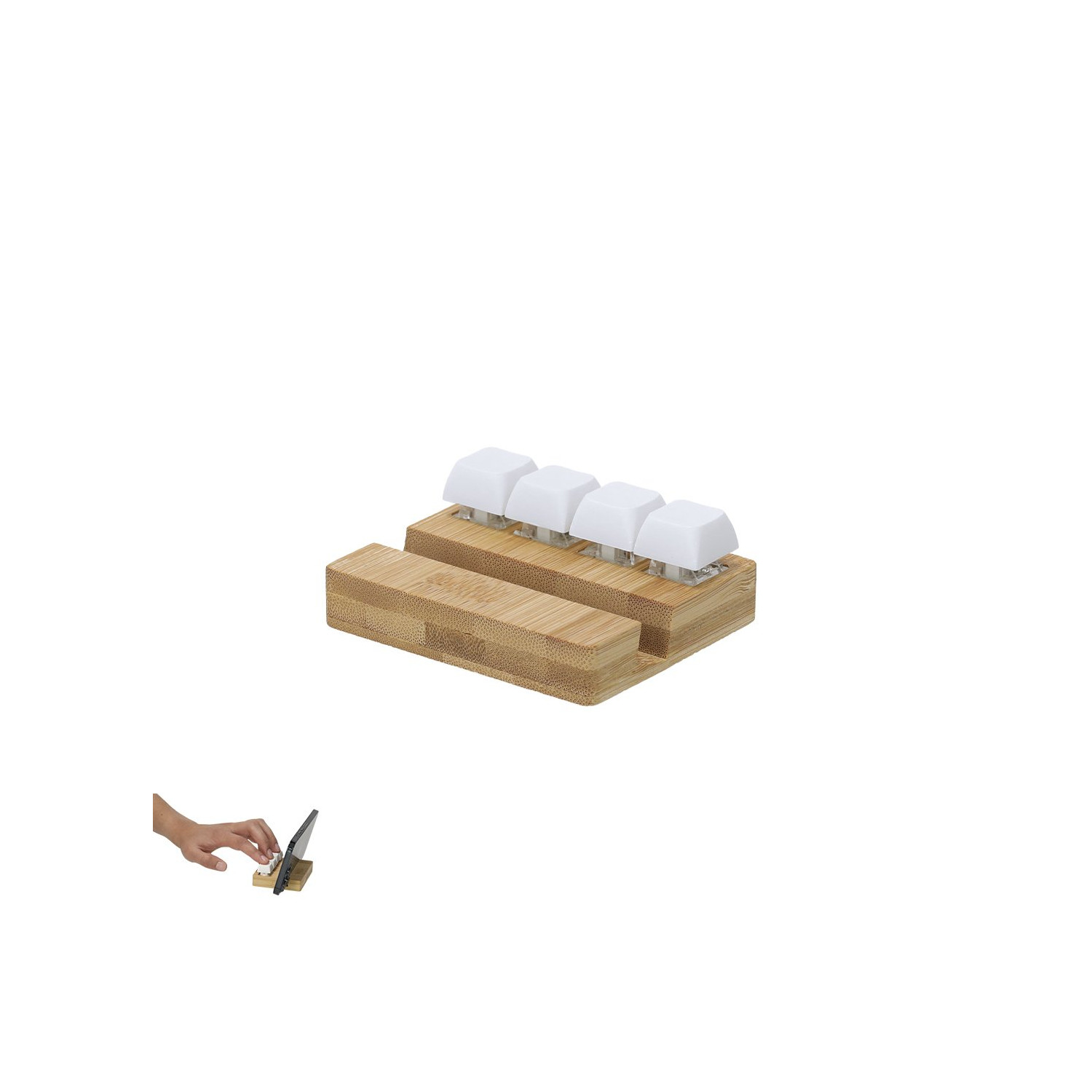 Originale supporto antistress realizzato in bambù. Con quattro tasti che imitano una tastiera meccanica da premere indipendentemente tutte le volte che è necessario, rilasciando la tensione. Include un pratico supporto per dispositivi mobili, combinando funzionalità e sollievo dallo stress in un design elegante.Materiali come il bambù promuovono l'uso di materie prime naturali, riducendo così le emissioni inquinanti. Proviene da una pianta altamente resistente e versatile, con una rapida crescita e rigenerazione, rendendola un'ottima alternativa all'uso del legno tradizionale.