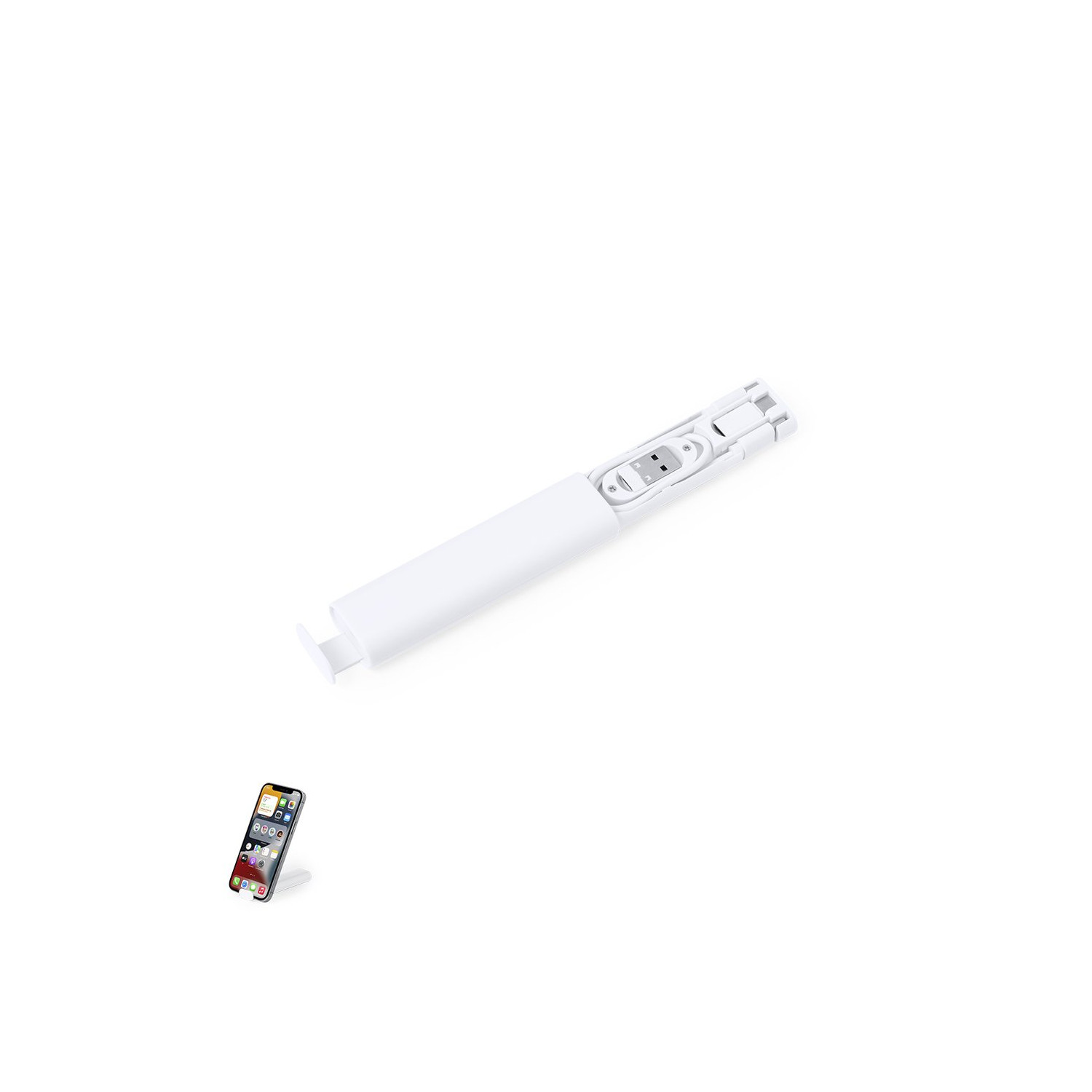 Set completo di cavi di ricarica in ABS resistente. Confezionato in una custodia compatta in resistente ABS bianco, con supporto per smartphone integrato. Include cavo di ricarica e di sincronizzazione, adatto per il trasferimento di dati e per connessioni multiple: Micro USB, Tipo C e Lightning; espulsore SIM incluso. 5V DC 3A. Presentato in una scatola dal design kraft.