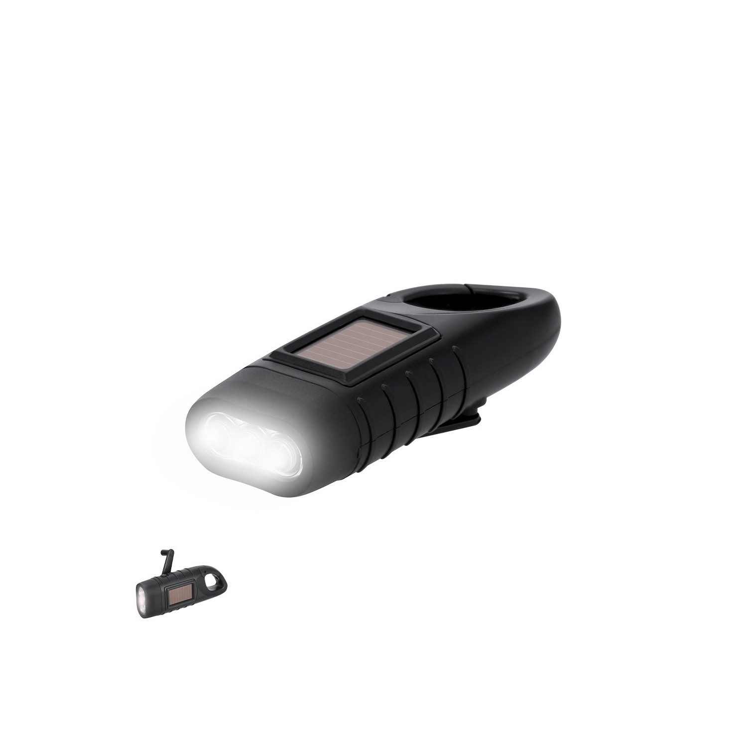 Torcia in ABS riciclato con ricarica solare e manuale tramite sistema dinamo regolabile a 360°. Dotata di 3 LED bianchi alimentati da pannello solare ricaricabile o da 3 batterie a bottone da 40 mAh. Include una pratica maniglia a moschettone per un facile trasporto. Una soluzione pratica per essere sempre preparati.