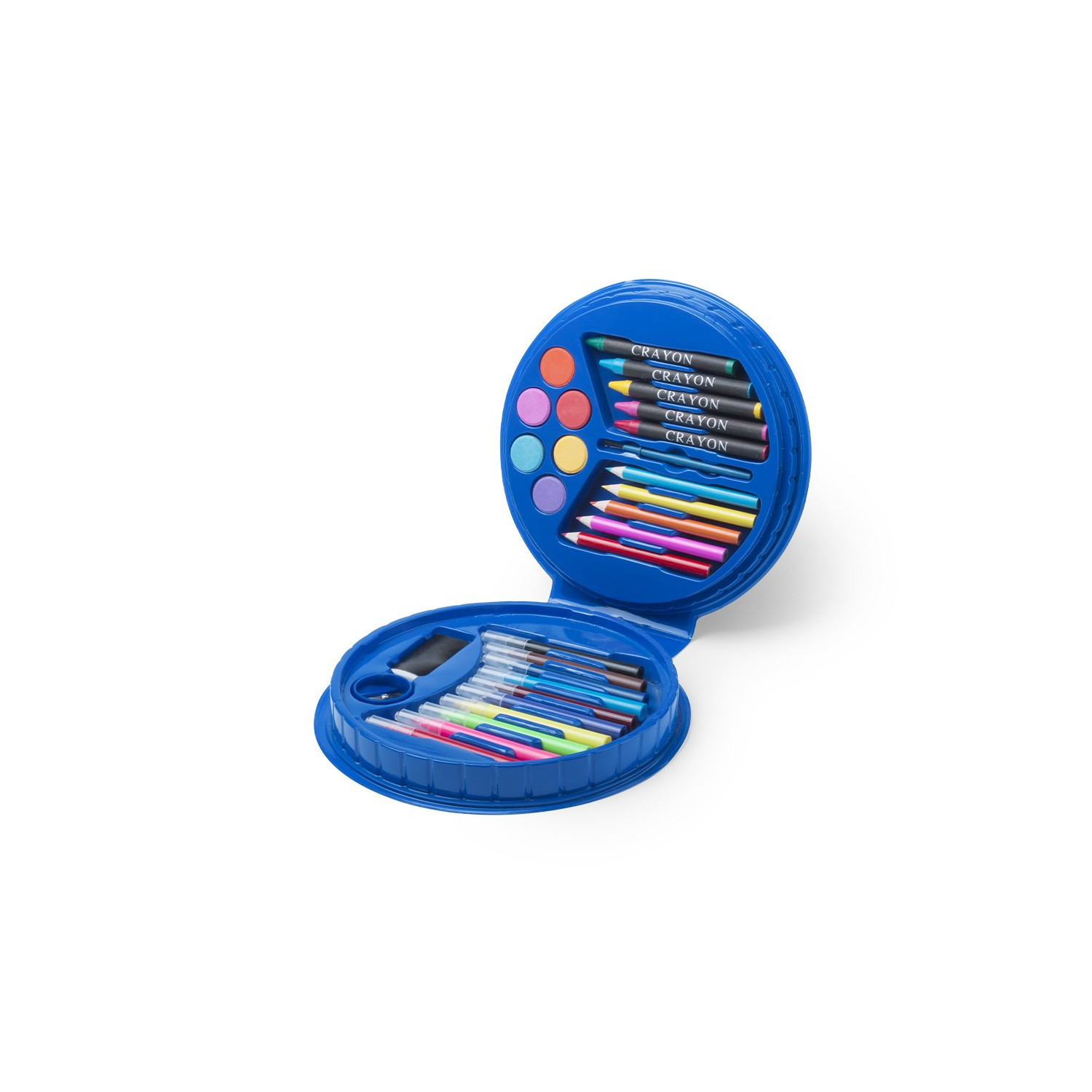 Set composto da 14 pezzi in astuccio dal design tondo, con corpo robusto rifinito in colori vivaci e interno con scomparti di sicurezza. Contiene gomma, temperamatite, pastelli e matite di legno con corpo cilindrico, pennarelli, acquerelli e pennello.