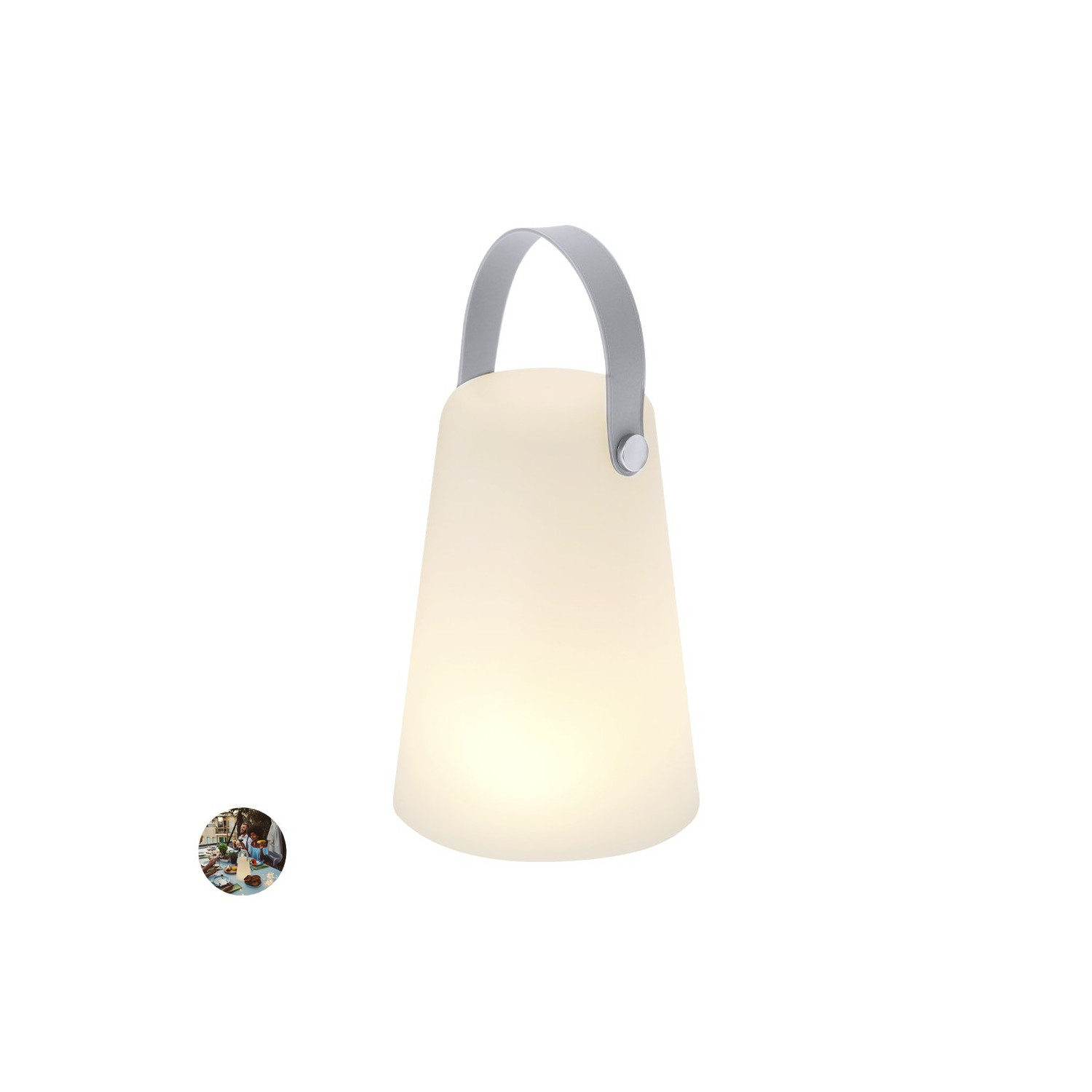 Lampada in PE di colore bianco. Include una maniglia superiore in morbida silicone grigio, che facilita il trasporto e aggiunge un tocco moderno al design. Equipaggiata con 4 LED, fornisce una luce uniforme ed efficiente, sia per interni che per esterni. Funziona con 3 batterie AA (non incluse). Dispone di un pulsante di accensione/spegnimento.