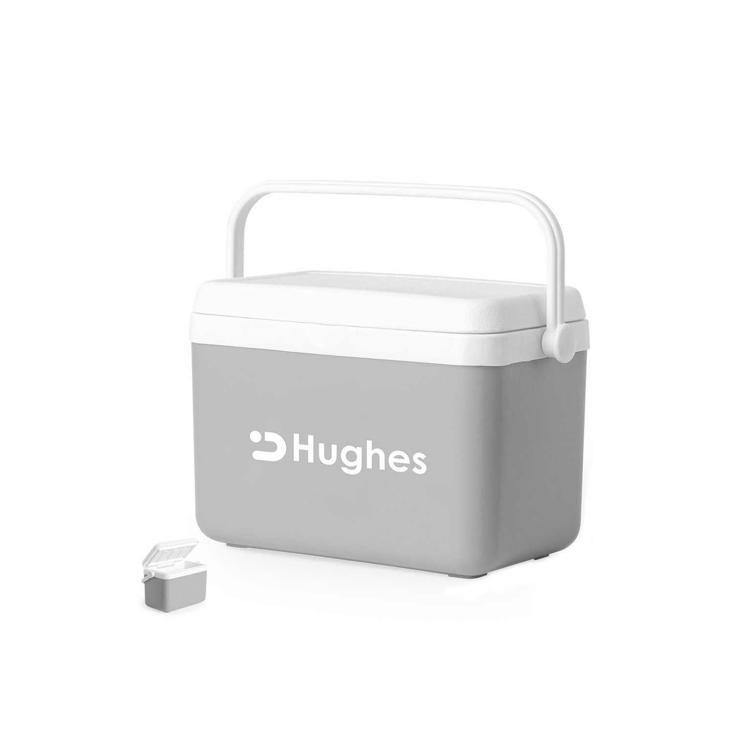Borsa termica da 4 litri in PP. Attraente design vintage per mantenere fredde bevande e cibi, design rigido a doppia parete. Coperchio incernierato con chiusura di sicurezza e maniglia rigida per un facile trasporto. Con base grigia e finiture bianche. Confezionata singolarmente in un sacchetto riciclato.