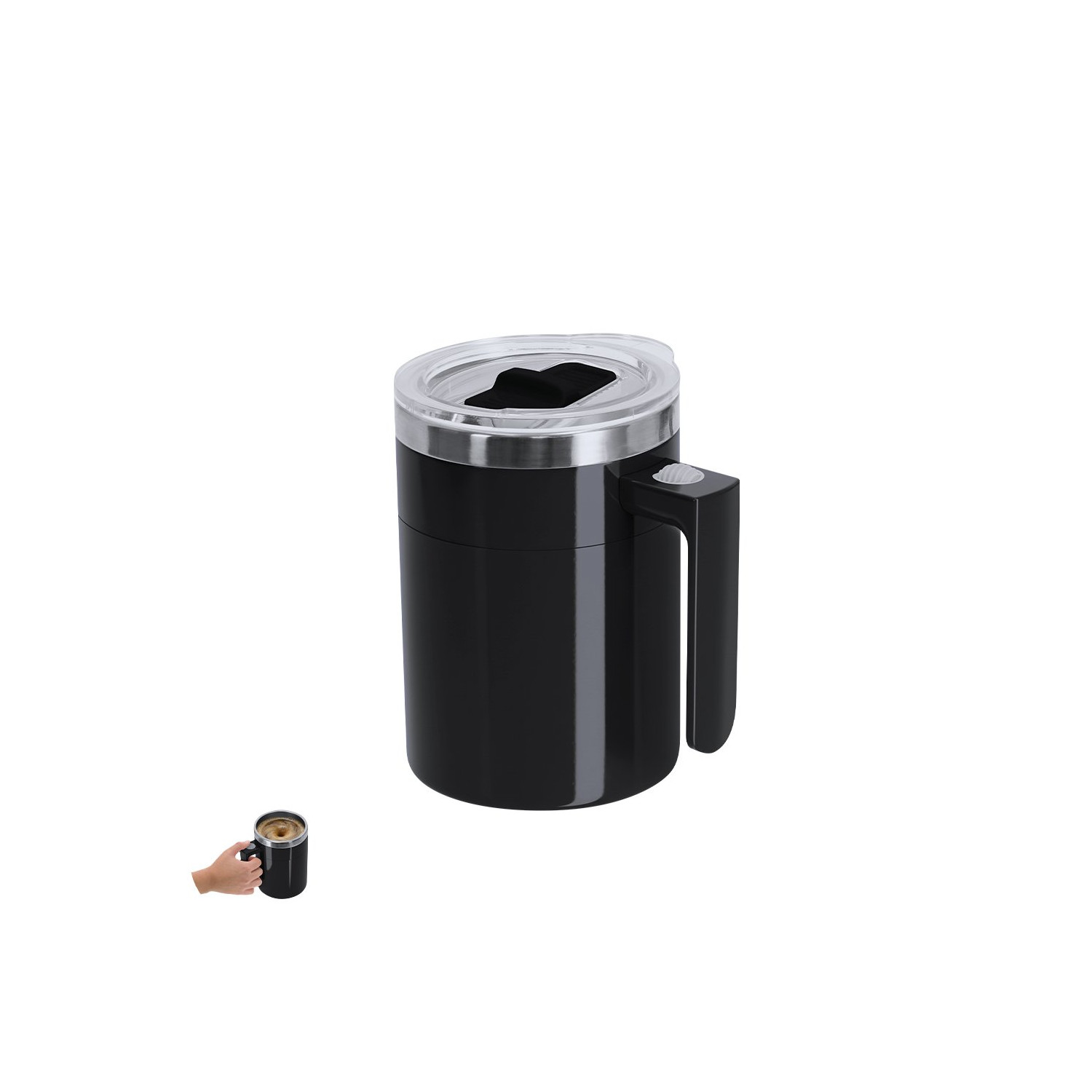 Tazza da miscelare realizzata in acciaio inossidabile resistente con una capacità di 400 ml. Include coperchio con ugello scorrevole. La base interna include un agitatore elettrico alimentato da 2 batterie AAA (non incluse). Con il pulsante on/off sulla maniglia.