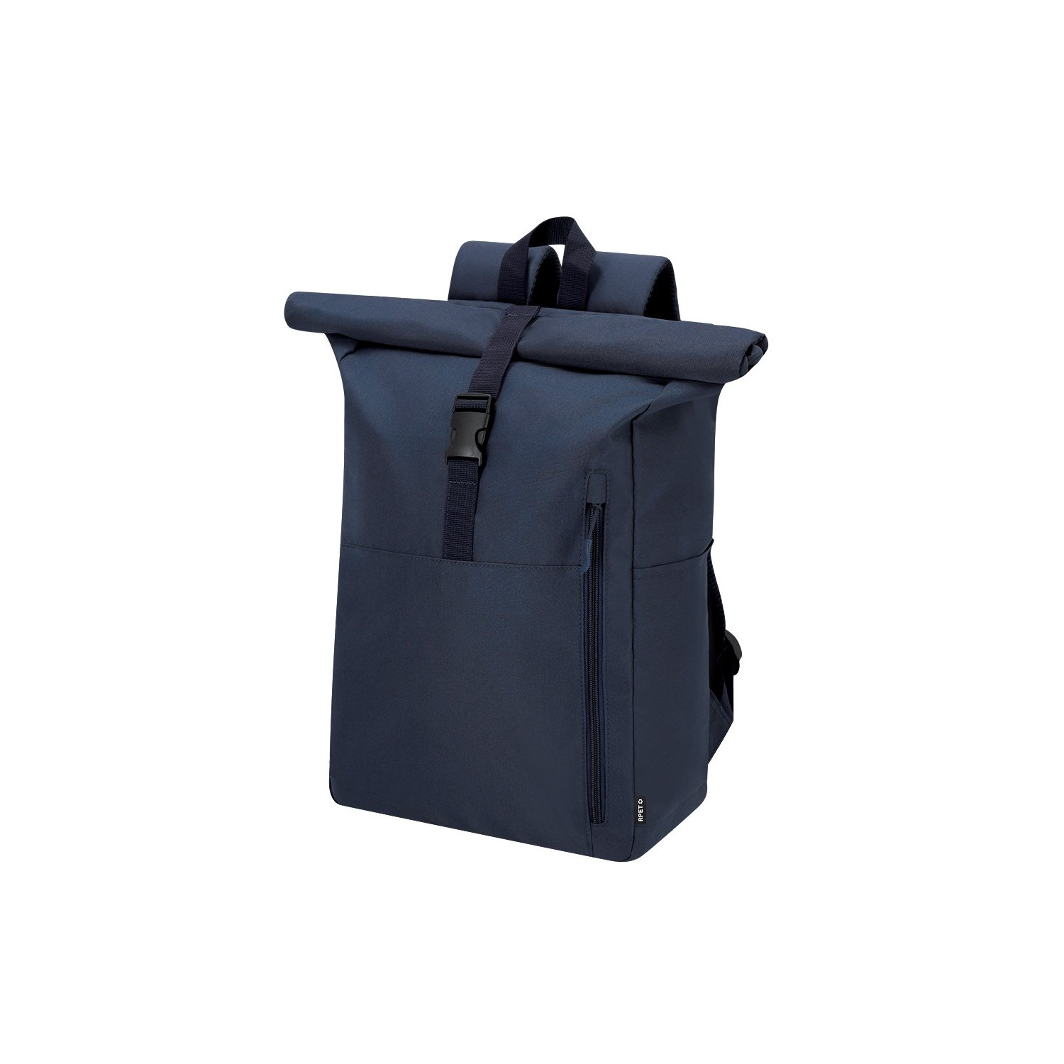 Zaino realizzato in resistente RPET 300D con chiusura arrotolata e fibbia. Dotato di due tasche frontali, una tasca posteriore con accesso laterale e due tasche laterali aggiuntive. Ampio scomparto interno con vano imbottito per laptop fino a 15 pollici. Spallacci e schienale imbottiti. Include fascia per il trasporto su trolley o valigia, ideale per viaggi e spostamenti. Il materiale RPET è realizzato a partire da plastica riciclata, promuovendo il riutilizzo dei rifiuti plastici e contribuendo alla sostenibilità del pianeta.