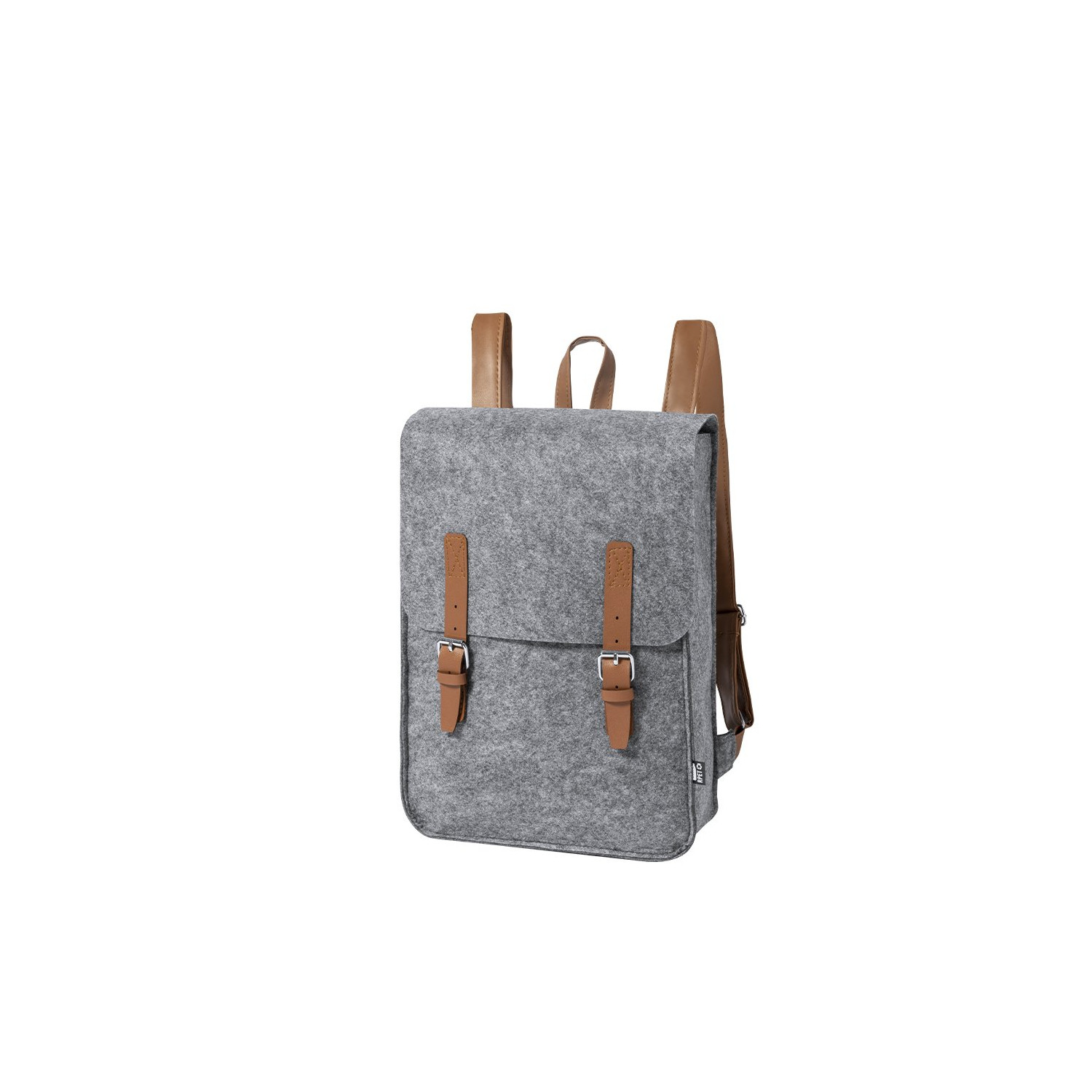 Zaino di design realizzato in resistente feltro RPET, con cinghie a zip, maniglia per il trasporto e spallacci in similpelle. Ampio scomparto principale, patta con cinghie regolabili e chiusura con fibbia metallica. Con spallacci regolabili e logo RPET sull'etichetta esterna.Il feltro RPET è il risultato della combinazione del processo di riciclo delle materie plastiche con la tecnica millenaria di produzione del feltro, da cui deriva un materiale di eco-tendenza che, oltre ad essere di origine riciclata, diventa anche riciclabile.