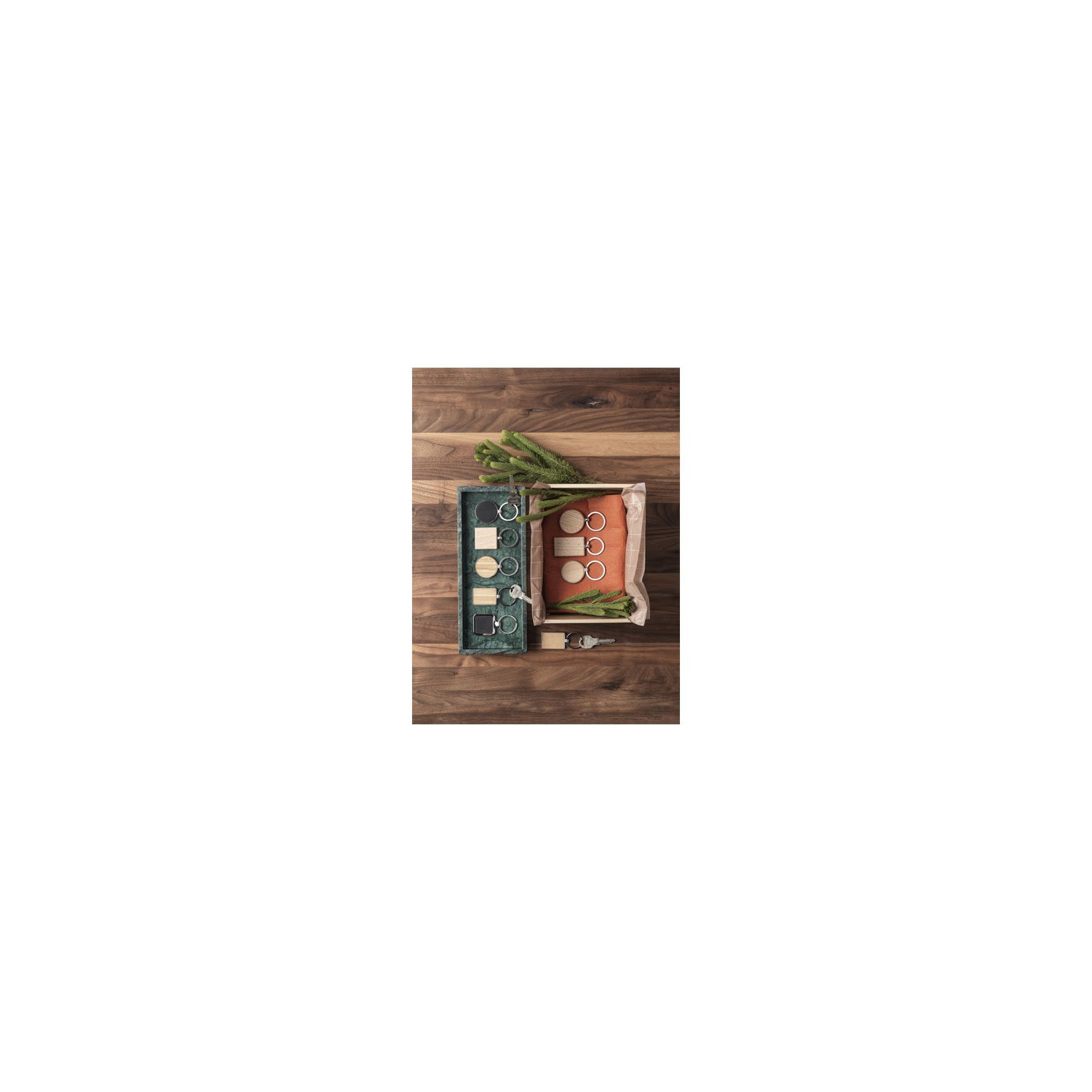 - Portachiavi rotondo di alta qualità in legno di faggio con case metallico in lega di zinco, confezionato in un involucro di carta Kraft marrone riciclata