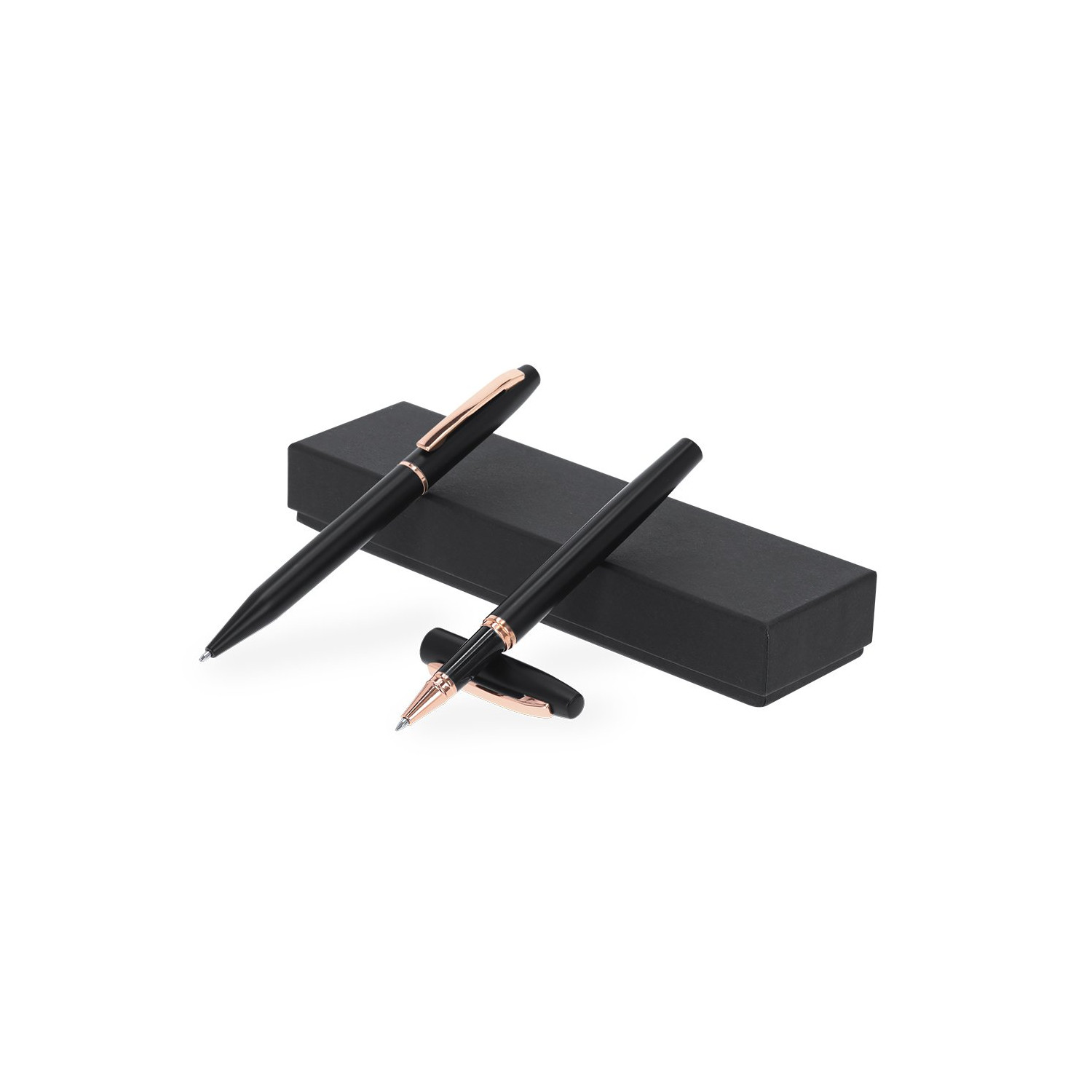 Set di penna a sfera e penna roller in alluminio riciclato, dal design elegante in nero opaco con finiture distintive in oro rosa. Penna a sfera con meccanismo a rotazione e penna roller con cappuccio, entrambe con clip in metallo. Inchiostro blu e logo in alluminio riciclato. Presentato in un elegante astuccio nero.L'alluminio riciclato è un materiale con possibilità di riciclaggio quasi infinite, che conserva le sue proprietà originali e consuma meno energia nel processo.Certificazione GRS (Global Recycled Standard), che garantisce l'origine riciclata del materiale utilizzato per produrre il prodotto.