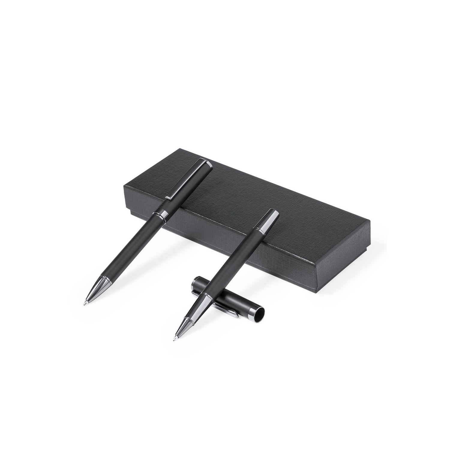 Elegante set di penna e roller. Penna con meccanismo a rotazione e roller con cappuccio, entrambe con clip in metallo. Con inchiostro blu, il fusto ha un'elegante finitura nera opaca e sottili accenti cromati. Presentato in un astuccio kraft nero, con interno fustellato in velluto.