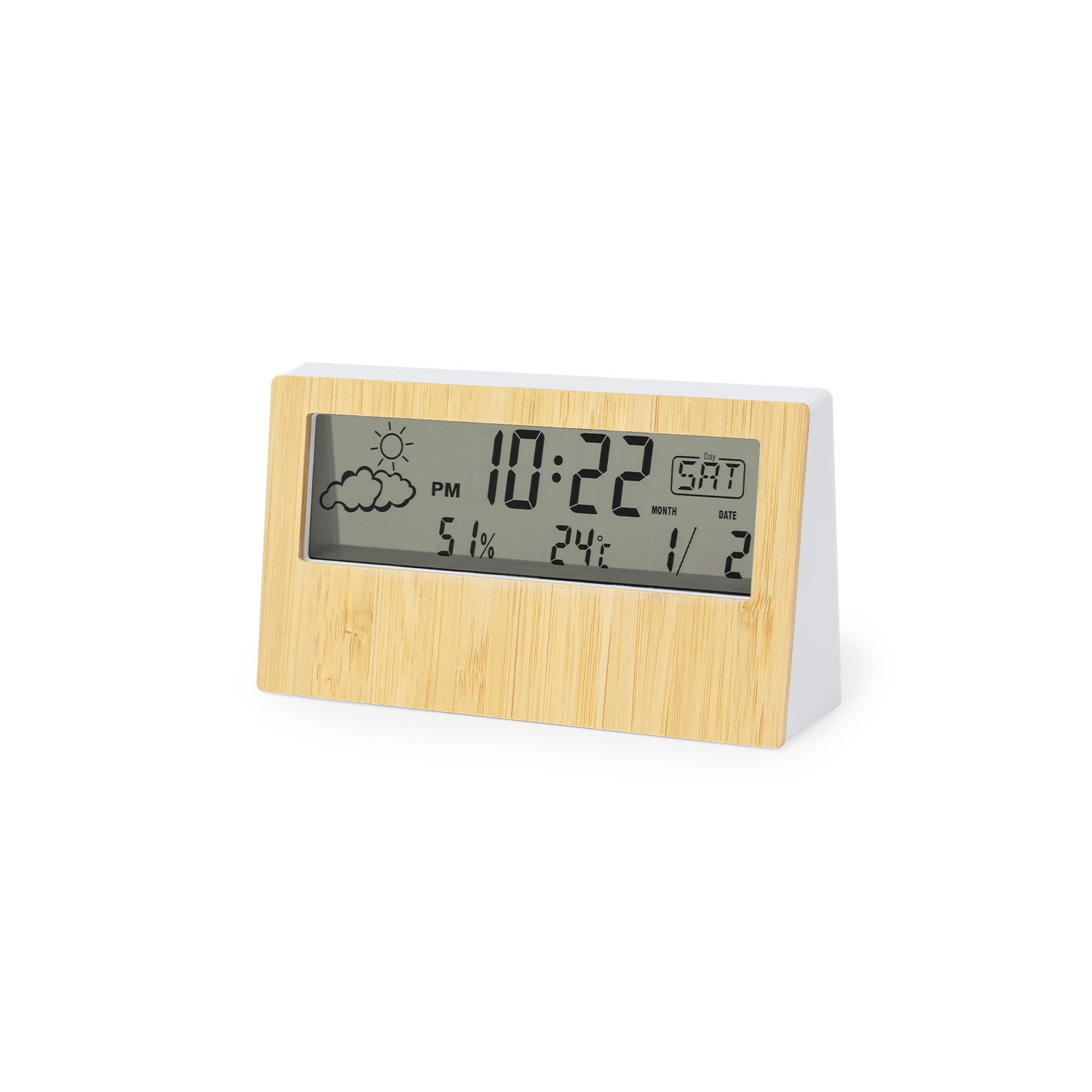 Stazione meteorologica con fronte in bambù. Con sensore di temperatura e umidità. Funzione calendario e allarme. Alimentata a batteria (1xAAA non inclusa) e presentata in un'attraente scatola dal design kraft. Manuale di istruzioni disponibile in inglese e spagnolo.Materiali come il bambù favoriscono l'uso di materie prime naturali, riducendo le emissioni inquinanti. Proviene da una pianta altamente resistente e versatile, con una rapida crescita e rigenerazione, rappresentando un'ottima alternativa all'uso del legno tradizionale.